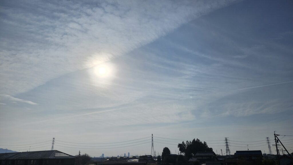 5日の空、薄雲が面白い形で見えていました。太陽の周りは少し虹色になっています。