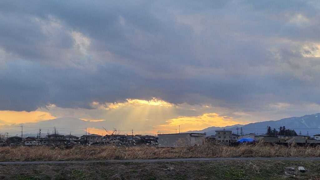 続く6日の夕空、さらに雲は厚みを増したので、今度は天使の梯子になりました。