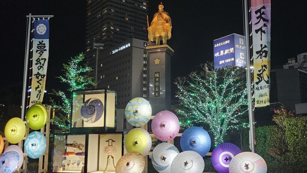 こちらは岐阜ではおなじみ、岐阜駅前の金の織田信長像と傘のイルミネーションです。ここでは写真を撮っている人が多かったです。